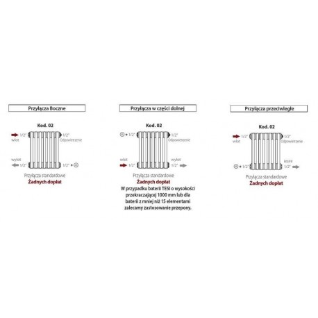 Standardowe podłączenie w grzejnikach Irsap Tesi to zasilanie boczne (kod 02). Możliwość zamówienia grzejnika za dopłatą w szerokiej gamie przyłączeń hydraulicznych.