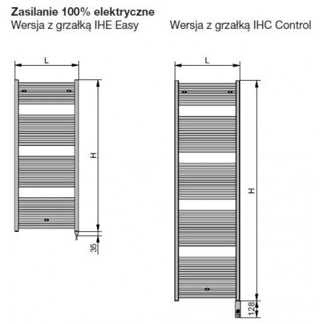 - wbudowana grzałka wybranego typu w dedykowanym kolorze standardowym, w dolnej części po prawej stronie zakończona przewodem z wtyczką Schuko