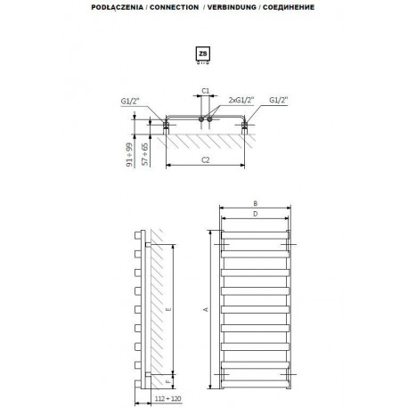 PODŁĄCZENIE ZS o rozstawie 470 mm dla przyłącza dolnego znajdującego się z osiach pionowych kolektorów grzejnika.
