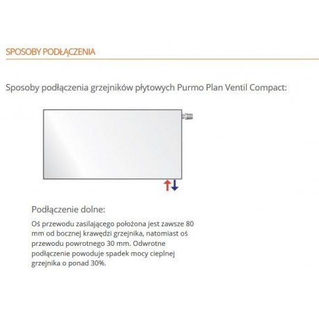 Stalowy grzejnik Purmo Plan Ventil Compact (FCV) podłączany jest z dołu lub z boku. Wyróżnia się idealnie gładkim wykończeniem płyty czołowej. Dzięki temu pozwala na uzyskanie nie tylko efektywnej, ale także estetycznej instalacji grzewczej.