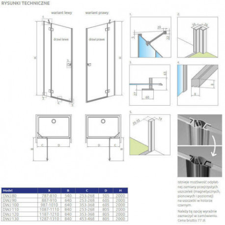 - Drzwi można zmontować bezpośrednio na podłodze lub na brodziku