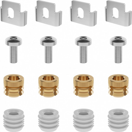 W opakowaniu 4 szt kompletnych zaczepów (zacisk, śruba, kołek mosiężny, kołek z tworzywa sztucznego).