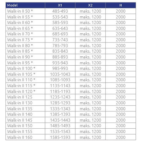 - Maksymalna odległość od ściany (X2): 1200 mm