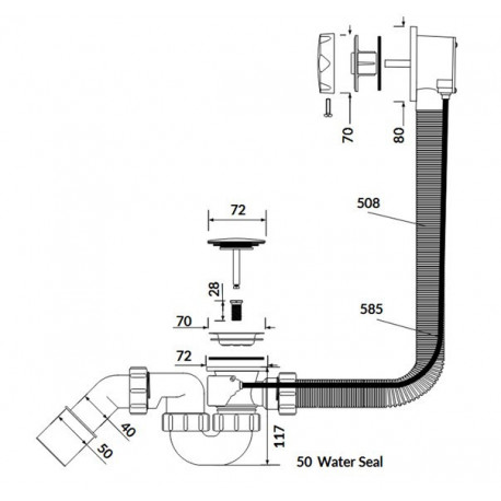 Uniwersalny syfon wannowy automatyczny z przelewem. Jest odpowiednim rozwiązaniem odpływu wody we wszystkich wannach Cersanit przeznaczonych do zabudowy. Wyjątkiem są wanny VIRGO 190, LARGA 180, LARGA 190 dla który dedykowany jest syfon z przelewem z przedłużoną do 70 cm rurką przelewu.
